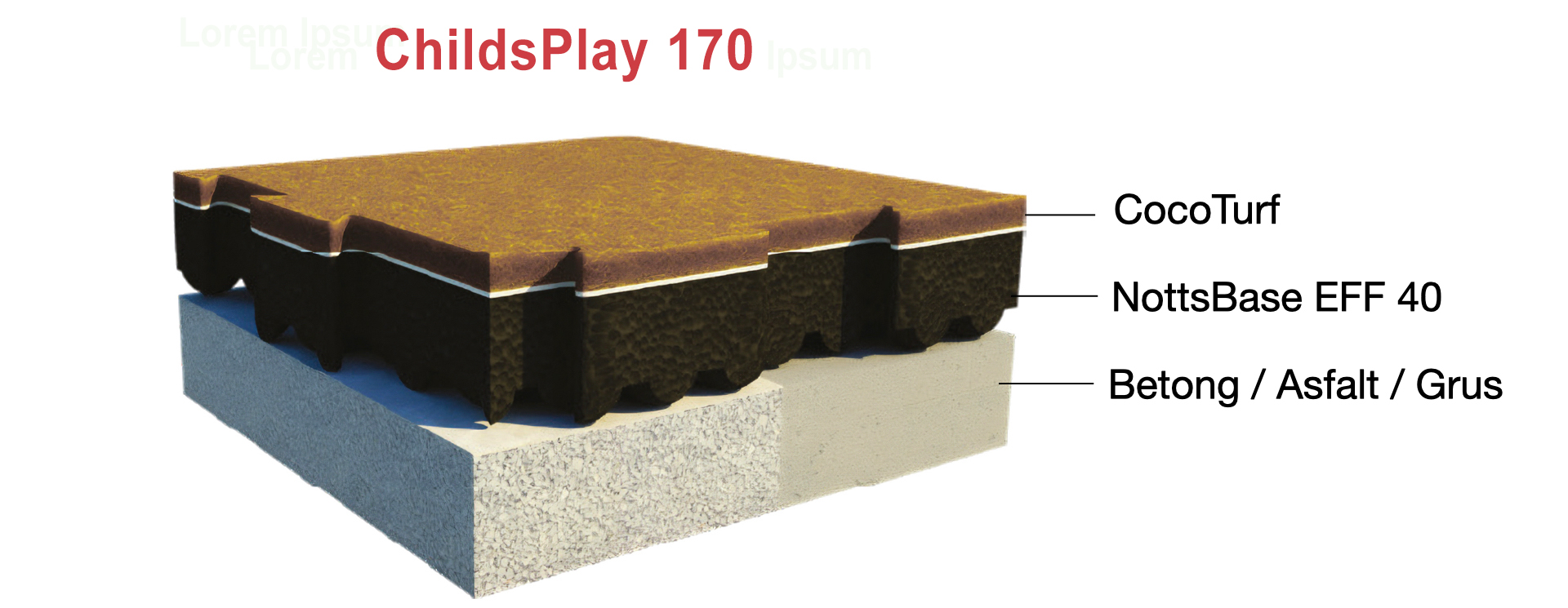 CocoTurf ChildsPlay-systemet er bygget opp av NottBase EFF støtabsorberende fliser, CocoTurf kunstgress og sand. CocoTurf ChildsPlay-systemet er delt inn i fem nivå/fallhøyde. Childplay 130, 170 (eksempel i illustrasjonen over) 210, 250 og 300 cm fallhøyde. NottBase EFF flisene er støpt med halvkuler under, en funksjon som er unik for ChildPlay. Halvkulen skaper et luftrom der energi spres ved støt, noe som gir en bedre ytelse i forhold til en tradisjonell EFF-flis. EFF står for ekspandert polypropylen.