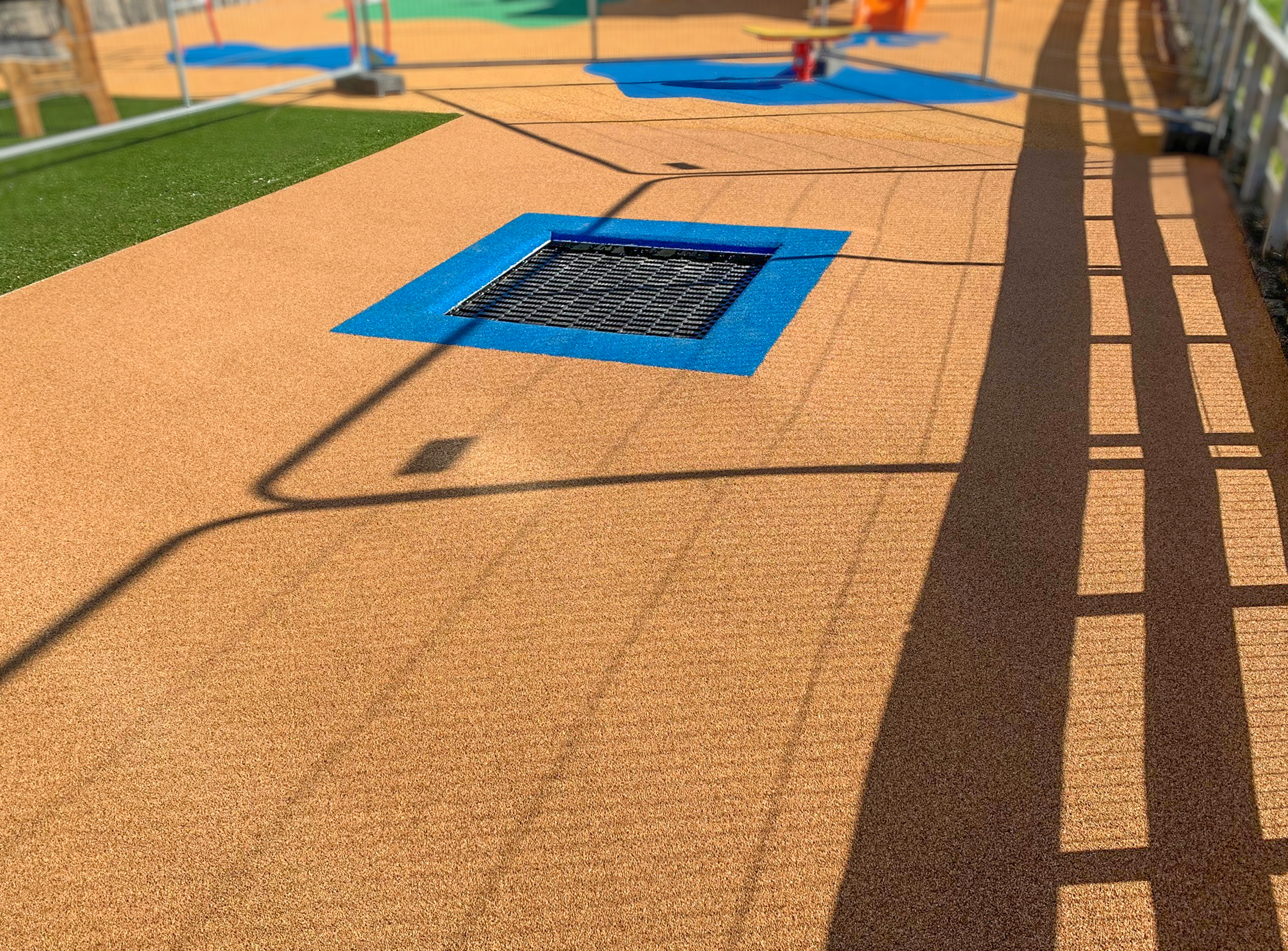 Corkeen Play Original har ekstremt god dreneringsevne. Selv etter en kraftig regskyll kan barna leke igjen, uten at det har dannnet seg dammer. En imponerende måling viser en vanngjennomtrengning på hele 72 000 mm/h. Kravet i EN 12616 er 150 mm/h. Altså nesten 500 ganger høyere vanngjennomtrengning en hva kravet sier. Korken er også nesten helt luktfri, og på varme dager med mye sol, blir den heller ikke så varm som andre fallunderlag. Overflatetemperaturen er faktisk 20% lavere enn andre syntetiske fallunderlag. Barn kan gå barbeint på den myke overflaten.