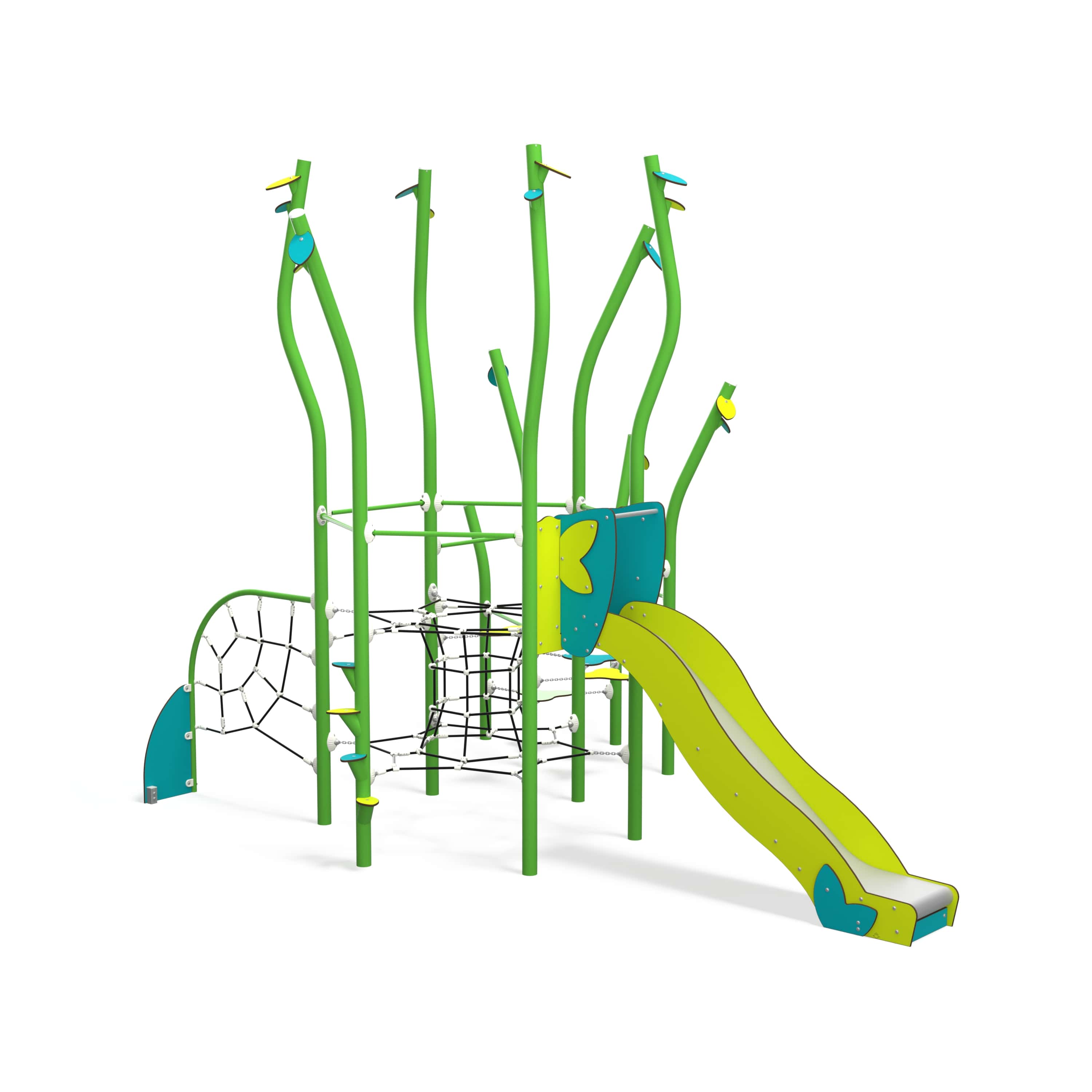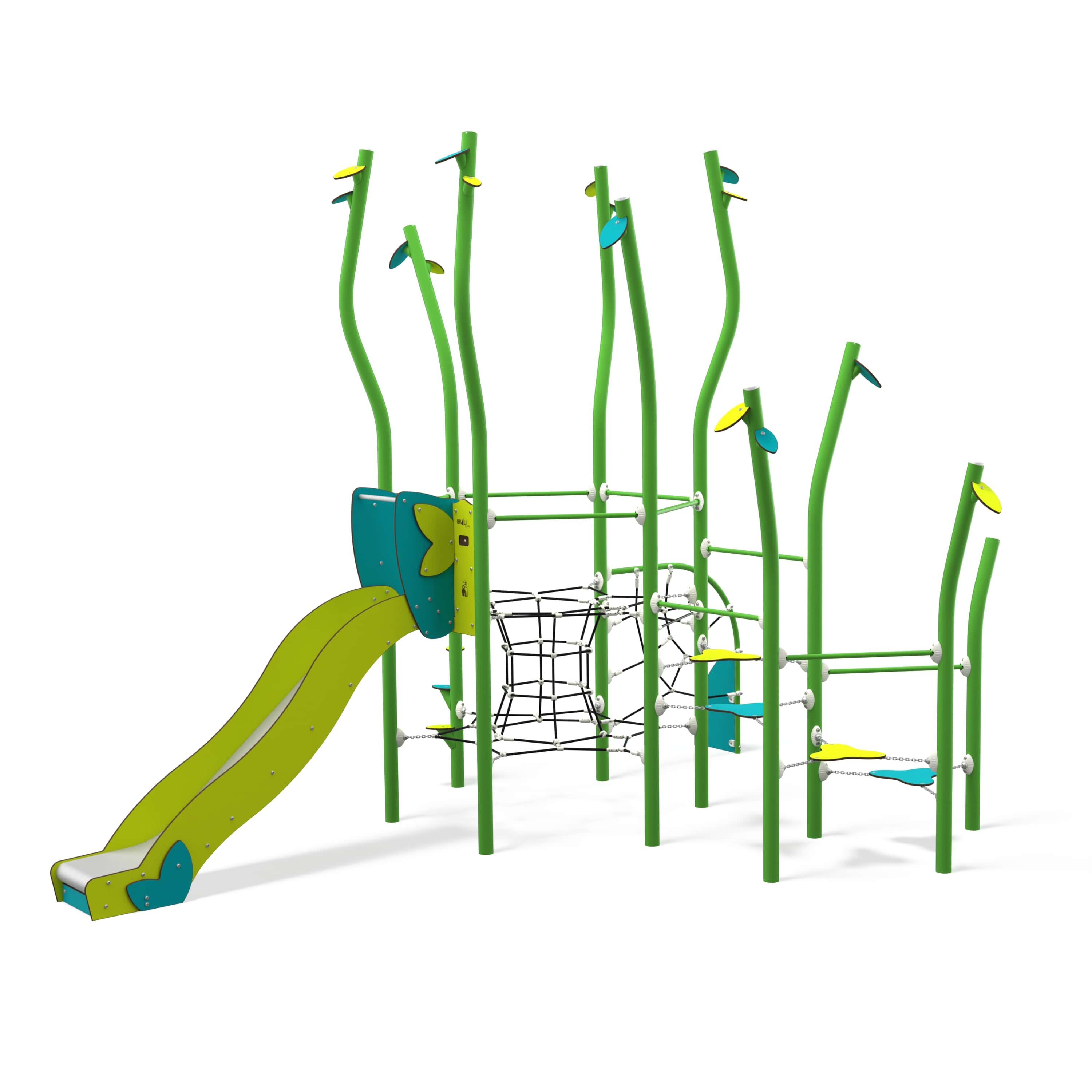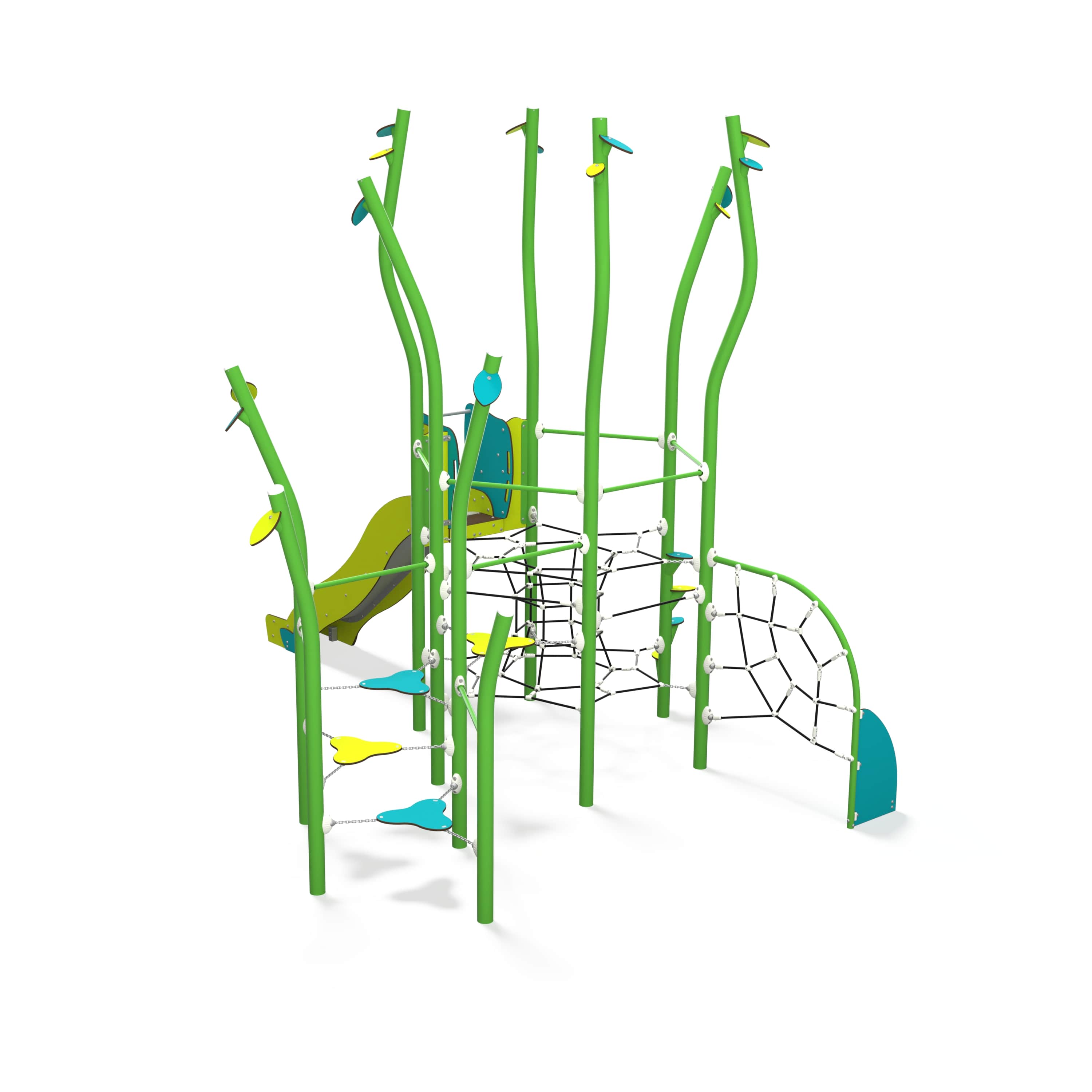 Skogsreisen er en klatremodul med organiske linjer og flere innganger. Inneholder balansedel, tauverk og vertikale klatreflater. Perfekt som overgangselement i større installasjoner.