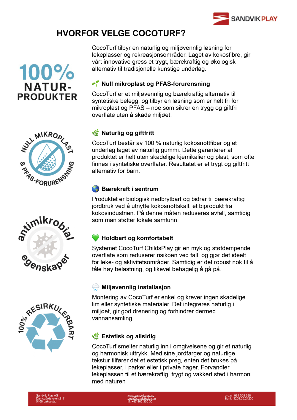 CocoTurf er verdens første kunstgress uten plast. CocoTurf er laget av 100 % naturlige produkter, og dermed en miljøvennlig løsning for lekeplasser og rekreasjonsområder. Det innovative kunstgresset er laget av bærekraftige kokosnøttfibre. Fibrene er festet til et tynnt sertifisert naturgummilateks lag. Dette gir et slitesterkt og miljøansvarlig alternativ til fallunderlag. CocoTurf er nedbrytbart, 100% resirkulerbart og fremmer bærekraftige jordbruksmetoder ved å gjenbruke kokosnøttskall, et biprodukt fra kokosindustrien. Dette bidrar til å redusere avfall og støtter lokalsamfunn.