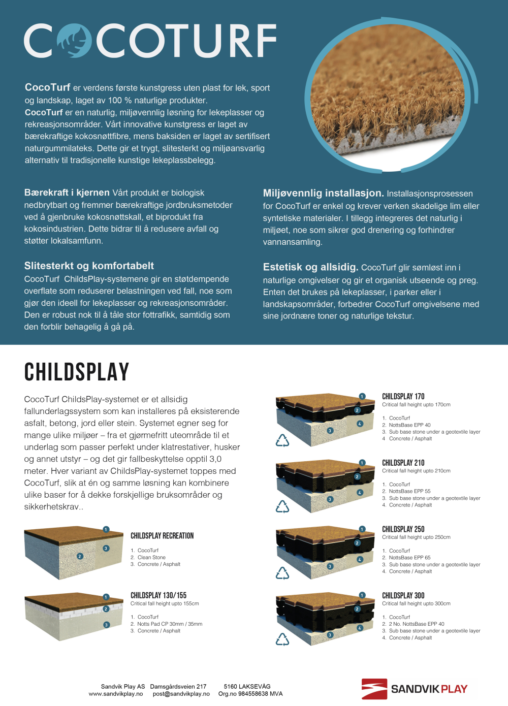 Fallhøyde opp til 3,0 meter. CocoTurf ChildsPlay-systemet er et allsidig fallunderlagssystem som kan installeres på asfalt, betong eller stein. Systemet egner seg for mange ulike miljøer. Passer perfekt under klatrestativer, husker og annet utstyr med en fallhøyde opptil 3,0 meter. ChildsPlay-systemet er bygget opp av NottBase EFF støtabsorberende fliser, CocoTurf kunstgress og sand.