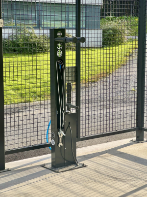 Vi kan også levere servicestasjoner i i forskjellige størrelser. Disse er utstyrt med verktøy for grunnleggende reparasjon og en sykkelpumpe med trykkmåler.